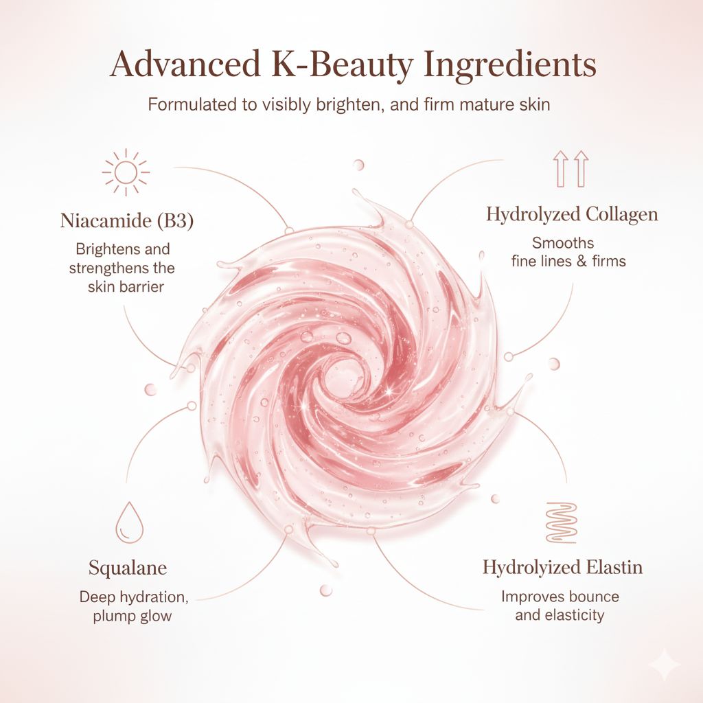 La nostra formula combina collagene marino attivo, acido ialuronico e un complesso di estratti botanici coreani per lavorare in profondità durante la notte.